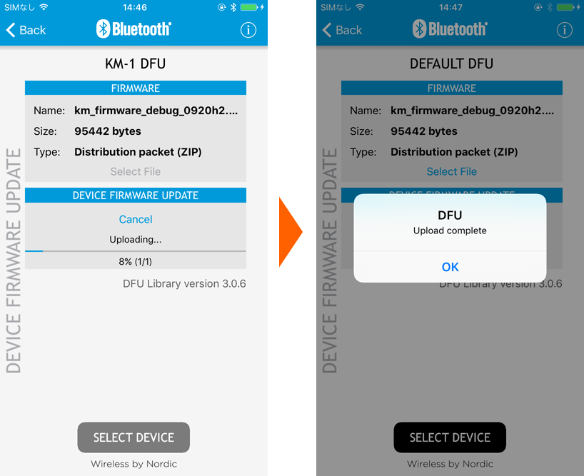 [alert]「nRF Toolbox で読み込む」ダイヤログが出ない場合や、Androidをお使いの方でうまくいかない場合は、nRF toolbox を使って直接ダウンロードフォルダを読みに行く方法をお試しください。以下の動画を参照下さい。 AndroidでnRF Toolboxから直接 zipファイルを読み込む