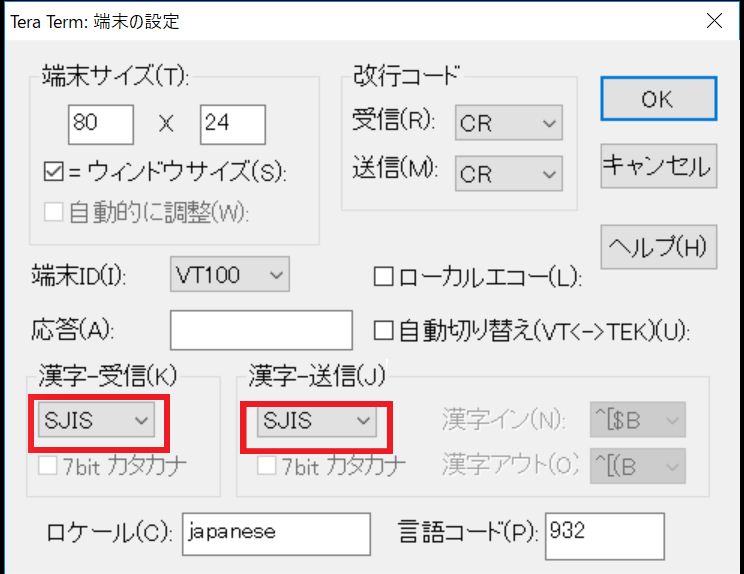 [漢字-受信] の設定が [SJIS] 以外の場合、バイトデータが正常に送受信できません。必ず本設定を行ってください。