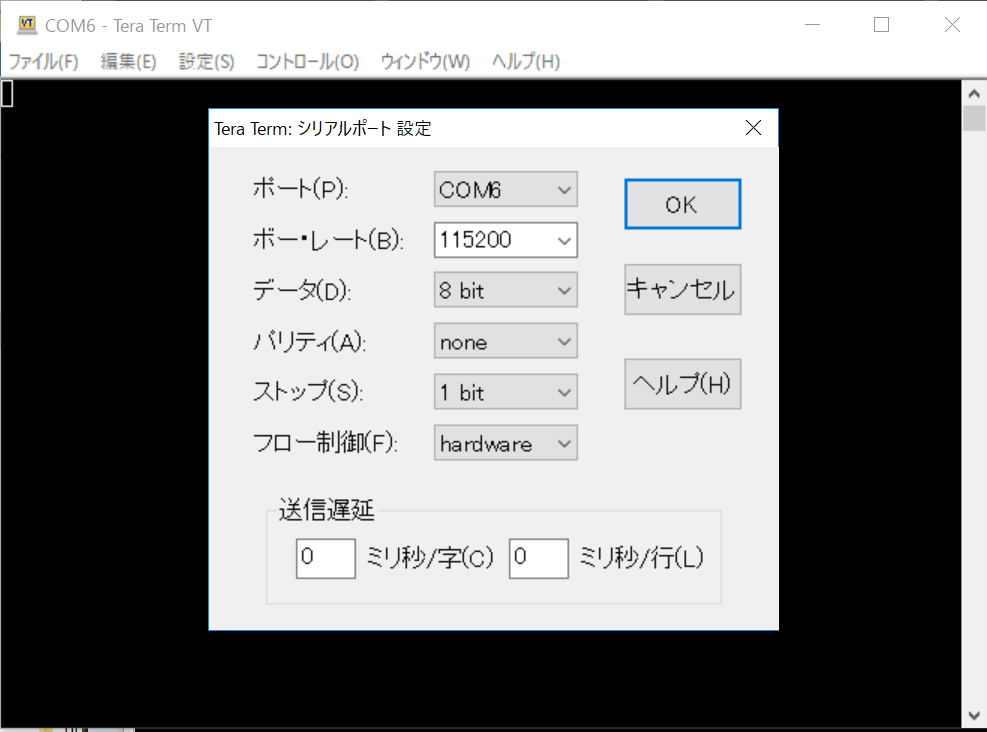 また、ボー・レートは 115200, フロー制御は hardware を選択して下さい。