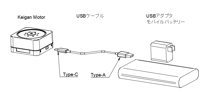 KeiganMotor の USB Type-C ポートをモバイルバッテリーに接続し、モーターの電源を入れます。